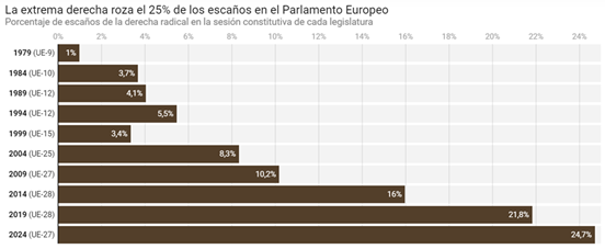 Flores, D. (June 10, 2024). La extrema derecha crece hasta rozar el 25% de los escaños del Parlamento Europeo, pero no será decisiva. RTVE.es https://acortar.link/sgj5Zi