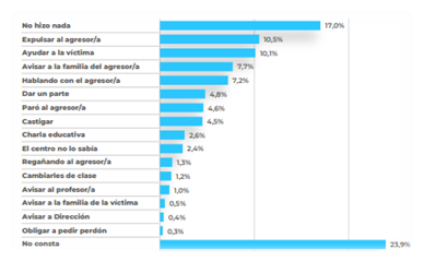La sociedad futura se encuentra en los centros educativos, donde la “educación” precisamente no se reconoce en los casos de acoso escolar donde no se hizo nada (así se recoge en la figura 4); el porcentaje de insultos, difusiones de rumores y agresiones físicas ha aumentado exponencialmente, en concreto del 79,8% hasta un 89,3% (Fundación Ayuda a Niños y Adolescentes en Riesgo, 2021).