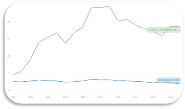Seguidamente, queremos dar visibilidad acerca de uno de los países con las tasas más bajas en esta cuestión, Corea del Sur. ¿Es realmente allí la educación un “ejemplo” que debemos considerar? En este sentido, cabe resaltar el aumento del gasto público en educación, del 4,3 al 4,7, siendo uno de los crecimientos más elevados (Banco Mundial, 2022a). No obstante, ¿cómo se muestra el coste en la realidad? En la sociedad surcoreana, la competitividad y la excelencia en los estudios, es símbolo de su cultura, a cambio de grandes presiones que provocan situarse entre uno de los países con mayor tasa de suicidio, con un 28,6, mientras que la media de los países de la OCDE es de 12 (Banco Mundial, 2022b) como se observa en el gráfico 2.
