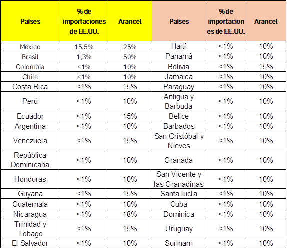 Como se puede observar en el cuadro 1, en el nuevo arancel impuesto por los Estados Unidos de Norteamérica, el más alto de la región de América lo tiene Brasil con un 50%, seguido de México con un 25% y Nicaragua con un 18%. Otras naciones como Costa Rica, Ecuador, Venezuela, Trinidad y Tobago y Bolivia presentan una nueva tarifa del 15%. El resto de los países incluyendo a la República Dominicana, están en el arancel más bajo que es el 10%. (Ver cuadro 1).