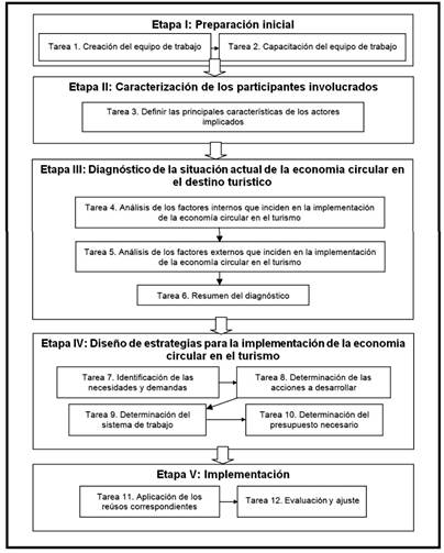 De ahí que se propusiera un procedimiento para implementar la economía circular en el turismo, cuya representación gráfica se muestra en la figura 1, el cual consta de cinco etapas que van desde la preparación inicial para incorporar la economía circular hasta la implementación, la evaluación y ajuste de la misma. Se proponen un conjunto de 12 tareas y las herramientas que soportan su aplicación.