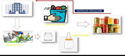 Este primer ciclo comienza cuando las instalaciones turísticas venden sus envases reutilizables (botellas de cristal, pomos plásticos) a la Empresa de Materias Primas, donde son procesados para su posterior venta a industrias, mini-industrias y productores individuales; quienes compran las tapas a industrias locales y elaboran productos como puré de tomate, mermeladas, encurtidos de col y pepino, salsa de pimientos, mayonesas y cremas de guayaba, que finalmente venden al hotel, cerrándose de esta forma el ciclo del envase (figura 2).