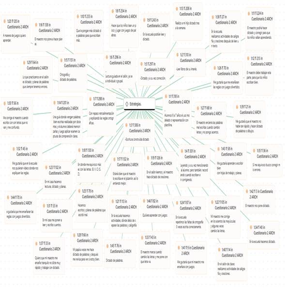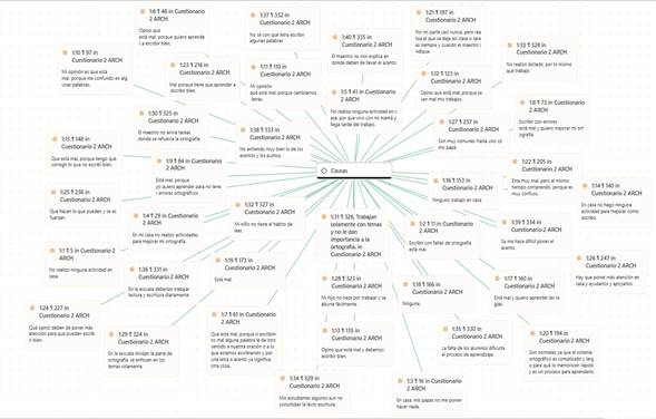 Una vez realizado el instrumento y aplicado para la recolección de datos, se generan redes con sus respectivas citas, identificando los principales elementos que requiere la investigación las cuales consisten en identificar causas consecuencias y estrategias para mejorar la ortografía en trabajos escolares de los estudiantes, estos analizados y codificados en el software Atlas. It, para comprender mejor y se visualice y tenga concordancia nuestro instrumento de recolección de datos.