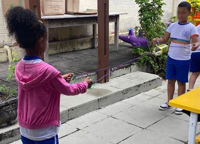 Durante a atividade, observou-se elevado engajamento das crianças, que demonstraram entusiasmo ao explorar o funcionamento do brinquedo e interesse ao descobrir que havia sido confeccionado com garrafas PET. O momento foi marcado por trocas espontâneas e de cooperação entre os pares, reforçando o potencial pedagógico da ludicidade como ferramenta de sensibilização ambiental.