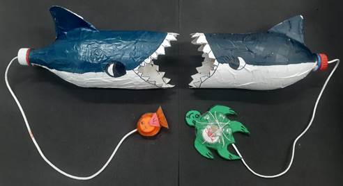 Bilboquê, confeccionado pela equipe do PROSA, com material reciclável, em formato de tubarão com a bola em formato de tartaruga e peixe.