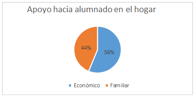 Gráfica 1. Se obtuvo que de los 20 encuestados el 44% mencionó que cuenta con el apoyo de su familia, esto quiere decir que son alumnos que se sienten seguros dentro de su hogar, que son menos propensos a una deserción escolar por motivos familiares. Por otra parte, el 56% indica que cuentan con un ingreso estable para continuar su educación tomando en cuenta gastos escolares (inscripción, transporte, alimentación, etc.)