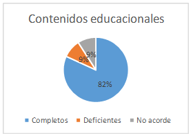Gráfica 3. El 82% menciona que sus contenidos van acorde a sus planes de estudios, que corresponden a lo presentado desde el primer momento, el 9% indica que sus planes tienen deficiencias, que si bien incluyen contenido relacionado a lo que se presenta no cubre por completo las áreas que se requieren, en este caso tuvimos un aspecto más, fue que su plan de estudio no cumple con lo establecido conforme a lo que estudian, puede ser por reformas, cambios, etc.