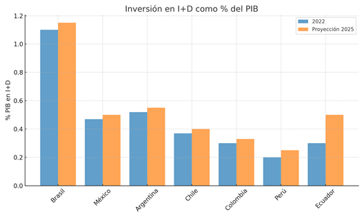 La inversión en I+D como % del PIB: Brasil y Argentina mantienen los valores más altos, cercanos o superiores al 1% mientras que Ecuador, aunque se proyecta en un aumento al 0,5% en 2025, sigue por debajo del promedio regional latinoamericano, reflejando limitaciones históricas en inversión.