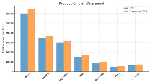 La producción científica anual: Brasil y México lideran las publicaciones, mientras que Ecuador presenta un crecimiento constante, con proyecciones a superar las 7200 publicaciones en 2025, aunque persiste una amplia brecha con los líderes regionales latinoamericanos.