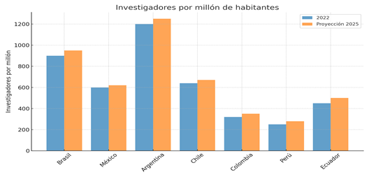Los investigadores por millón de habitantes, lideran Argentina y Brasil con una mayor densidad de investigadores, Ecuador, con una proyección de 500 por millón en 2025, evidencia la necesidad de fortalecer la formación y retención del talento.
