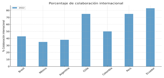 El porcentaje de colaboración internacional: Ecuador, Chile y Perú presentan altos niveles de colaboración internacional por encima del 70% lo que favorece la calidad e impacto, pero refleja la dependencia de redes externas y cooperación internacional.