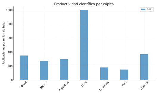 La productividad científica per cápita Chile lidera ampliamente, seguido por Argentina y Brasil. Ecuador por su parte mejora la productividad, pero requiere mayores inversiones y desarrollo de capacidades internas para alcanzar los niveles líderes.