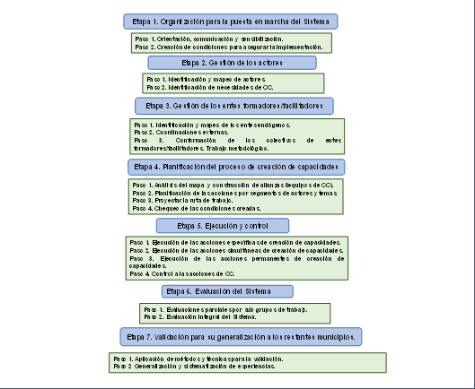 Para realizar la implementación del sistema de creación de capacidades por los gobiernos municipales se ha concebido un procedimiento para la implementación conformado por una serie de etapas y pasos. (Figura 2)