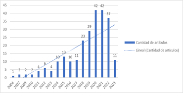 De acuerdo a los resultados de la revisión biométrica, en la primera década del 2000 la producción de artículos sobre la temática era inferior a dos. A partir del 2010, se empieza a incrementar la cantidad de publicaciones por encima de diez (Gráfico 1). Los años 2020 y 2021 fueron los de mayor producción científica, probablemente por el panorama de la pandemia COVID-19, en la que se evidenció un mayor interés por los autores en la temática. De esta forma, el gráfico muestra un crecimiento lineal de las producciones sobre la temática, alcanzando un total de 161 artículos en los últimos 5 años, lo que representa un 63,63% del total de artículos, lo que indica un alto grado de actualidad e interés en el tema e importancia.