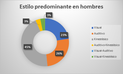 En el análisis por género, se encontró que del total de hombres que participaron en la aplicación del test, en el 45% prevaleció el estilo de aprendizaje kinestésico, el 26% asimila mejor la información a través del canal auditivo, mientras que el 23% lo hace de forma visual.