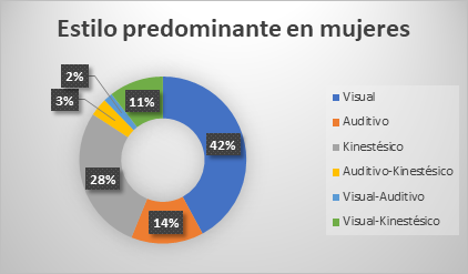 Para el caso de las mujeres, el 42% aprende mejor a través del canal visual, en el 28% prevaleció el estilo kinestésico, mientras que el 14% asimila mejor la información de forma auditiva.