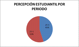 En la figura 3 se observa un incremento de 10 puntos porcentuales en la valoración positiva por parte de los estudiantes, al comparar los periodos mayo-agosto 2024(24-3) y septiembre-diciembre 2024 (25-1). Durante el primer periodo, representado en color azul, la percepción positiva alcanzaba el 45%, mientras que, en segundo periodo, indicando en color rojo, se elevó al 55%.