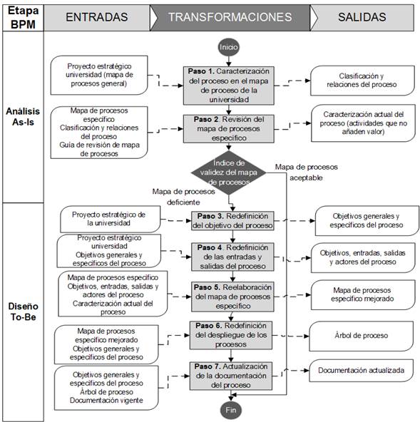 Para el rediseño del proceso se empleó el procedimiento de la figura 1 que consta de siete pasos que se basan fundamentalmente en el BPM. Asimismo, se auxilia de una guía de revisión que permite definir un índice de validez para el mapa de procesos objeto del estudio (Tabla 1).