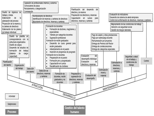 Como resultado del análisis se confecciona un nuevo mapa de procesos (Figura 4) que responde al ciclo de atraer, desarrollar y mantener como los tres sistemas donde pueden agruparse los subprocesos claves de la gestión del talento humano. En el caso del mantenimiento también se asocia al subproceso de seguridad y salud en el trabajo y condiciones de trabajo que garantiza la atención a las necesidades psicofisiológicas del talento humano. En la propuesta de mapa se aprecian las distinciones en el tratamiento a los estratos (docentes, no docentes y directivos), así como se representa el alineamiento del talento con las necesidades de los procesos. De los subprocesos se redefinen los despliegues con el empleo del árbol del proceso (Figura 5), donde se incluyen las actividades que añaden valor y aquellas que son necesarias para su ejecución.