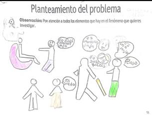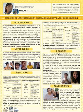 El cuadernillo se le entregó a la menor de manera física y a la mentora de manera digital. En éste, se plasmaba, con dibujos o texto (según lo solicitado por el ejercicio del cuadernillo), diferentes tareas relacionadas al conocimiento científico y registro de los avances del tema de investigación propuesto por la niña, en este caso el título del proyecto fue: Derechos de las Personas con Discapacidad: una vida sin discriminación.