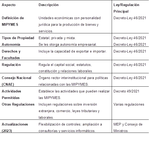 El marco regulatorio cubano para las MIPYMES (Decreto-Ley 46/2021) establece su personalidad jurídica, autonomía y facultades, sentando las bases para la colaboración interempresarial (ver Tabla 1).