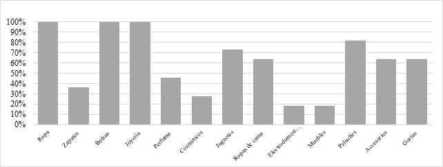 Los resultados evidencian que el grupo con mayor representación corresponde a personas entren los 21 y 30 años. Lo cual pueden atribuirse a su familiaridad y habilidades con el uso de herramientas tecnológicas. No obstante, es importante destacar que el 18.2% de las participantes mayores a 50 años afirmaron manejar con soltura las redes sociales, a pesar de que su formación y desarrollo no estuvieron inmersos en un entorno digital, lo que revela procesos de adaptación significativa. En cuanto al estado civil, el 54.5% se identificó como soltera, el 36.4% como casada y el 9.1% como viuda. Asimismo, el 72.7% de las entrevistadas señaló contar con formación profesional. Respecto a los productos que comercializan, se identificó que el 100% corresponde a mercancía de origen americano, la cual se distribuye de la siguiente forma (Grafica 1).