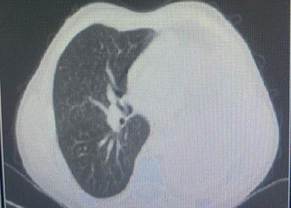 Inicia su padecimiento en octubre de 2014, de manera insidiosa con tos productiva, acompañada de expectoración blanquecina, sin predominio de horario. La tos se intensificó durante el día y ocasionalmente interrumpió el sueño nocturno. Una semana después aparecieron episodios esporádicos de hemoptisis, descritos como expulsión de pequeñas cantidades de sangre fresca mezclada con expectoración. Estos síntomas se acompañan de fiebre de predominio vespertino, escalofríos ocasionales y sudoración profusa nocturna. De forma paralela, presentó astenia, adinamia, hiporexia y pérdida de peso no intencionada de aproximadamente 7 kg en pocas semanas. Agregándose dolor torácico infraclavicular derecho, exacerbado por inspiración profunda y la tos, sin alivio significativo con el reposo o analgésicos. Persistieron la tos, la disnea leve a esfuerzos moderados y los episodios ocasionales de hemoptisis, motivo por el cual acudió a valoración médica. Sin antecedentes personales de enfermedades respiratorias crónicas o contacto con personas con tuberculosis ni viajes recientes, se decidió su hospitalización para protocolo de estudio. Realizándose de manera inicial tomografía axial computarizada (TAC) de tórax inicial, la cual reveló una imagen sugestiva de proceso neoplásico en el lóbulo superior pulmonar izquierdo. Posteriormente, en noviembre de 2014 se efectuó broncoscopia diagnóstica, evidenciándose una lesión tumoral endobronquial de la cual se tomaron biopsias dirigidas, cuyo resultado fue neoplasia maligna epitelial de alto grado, ulcerada y necrosada, del tipo células aveniformes. El 8 de diciembre de 2014, un nuevo estudio anatomopatológico confirmó la presencia de neoplasia maligna poco diferenciada, compatible con carcinoma de células pequeñas de pulmón, con abundante necrosis y una reacción linfocítica prominente. El 17 de febrero de 2015, una nueva TAC de tórax realizada en el Hospital General de Zona No. 1 mostró opacificación total del parénquima pulmonar izquierdo, compatible con progresión neoplásica (Figura 1), así como múltiples lesiones micronodulares de distribución intersticial en el pulmón derecho, sugestivas de linfangitis carcinomatosa (Figura 2). Los hallazgos radiológicos fueron además compatibles con neumoconiosis silicótica. Confirmado el diagnóstico, el paciente fue referido al servicio de Oncología, donde inició tratamiento especializado con radioterapia. La evolución radiológica evidenció progresión tumoral y compromiso bilateral con patrón micronodular difuso.