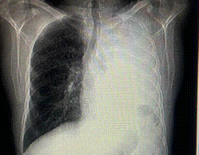 Nota: Hemitórax izquierdo con opacidad casi completa, borramiento de ángulos costodiafragmáticos, desplazamiento del mediastino al lado contralateral.
