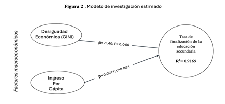 Mientras, que el ingreso per cápita, también es un indicador que afecta positivamente la tasa de egreso de la educación secundaria (β= 0.0011, p=0.000), cuyo resultado está alineado con Hanushek y Woessmann (2020) que afirman que los ingresos que obtienen las familiares están positivamente correlacionados, con la finalización de la educación secundaria.