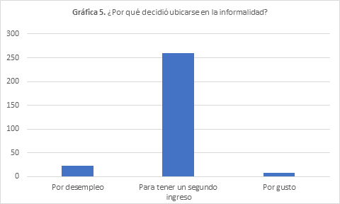Otra conclusión que se registra es que el crecimiento del comercio informal se debe a diversos factores entre los cuales se pueden anotar: la ausencia de pago de impuestos, la baja remuneración de los empleos formales que se ofrecen a nivel local, el acceso a ingresos para solventar gastos diarios en hogares, el desempleo, el bajo costo que cobra el municipio por instalarse informalmente, el desinterés de los comerciantes informales por convertir su actividad comercial a la formalidad, la comodidad de los organismos municipales para cobrar impuestos en efectivo, la ausencia de regulación y que los ingresos obtenidos por realizar actividades informales son parte de un segundo ingreso que obtiene un sector de la población para compensar el ingreso de efectivo en los hogares que les proporciona un empleo formal.