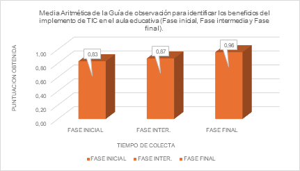 Nota: Media aritmética de la guía de observación para identificar los beneficios del implemento del TIC en el aula (Fase inicial, Fase intermedia y Fase final).
