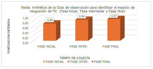 Nota: Media aritmética de la guía de observación para identificar el impacto de integración de TIC (Fase inicial, Fase intermedia y Fase final).
