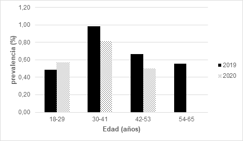 El análisis por intervalos de edad (tabla 2 y figura 1) reveló que el grupo de 30 a 41 años presentó la mayor prevalencia en ambos años estudiados. En 2019, este grupo registró una prevalencia de 0.98%, mientras que en 2020 fue de 0.81%. El grupo de 18 a 29 años presentó prevalencias de 0.49% y 0.57% para 2019 y 2020, respectivamente. El grupo de 42 a 53 años mostró prevalencias de 0.66% en 2019 y 0.51% en 2020.Un hallazgo notable fue la ausencia de casos positivos en el grupo de 54 a 65 años durante el año 2020, mientras que en 2019 este grupo presentó una prevalencia de 0.56%. Esta variación podría atribuirse al menor número de donadores en este rango etario o a fluctuaciones estadísticas relacionadas con el tamaño muestral.