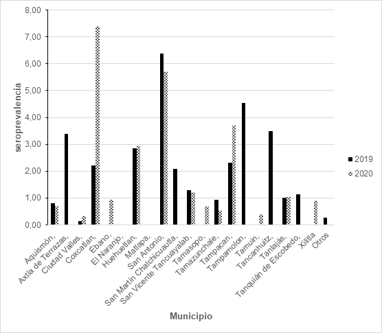 Interesantemente, los siguientes municipios registraron seroprevalencia en 2019 únicamente: Tampamolón (4.55%) Tancanhuitz (3.49%) y Axtla de Terrazas (3.39%), San Martín Chalchicuautla: 2.08%. Los que presentaron seroprevalencia solo en el 2020 fueron Ébano (0.93%), Tamasopo (0.67%), Tamuin (0.39%), y Xilitla (0.9%).