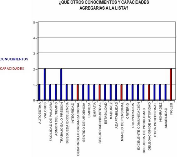 En una tercera pregunta los sujetos aportaban los conocimientos y capacidades no enlistadas que ellos consideran importantes y agregarían a la lista. Este tipo de cuestionarios son fáciles de aplicar, contestar y codificar, puesto que se analizan las respuestas por medio de tablas de frecuencias relativas que se interpreta con porcentajes de incidencias que tuvo cada conocimiento o cada capacidad. Se utilizaron gráficas de Excel para mostrar las frecuencias relativas.
